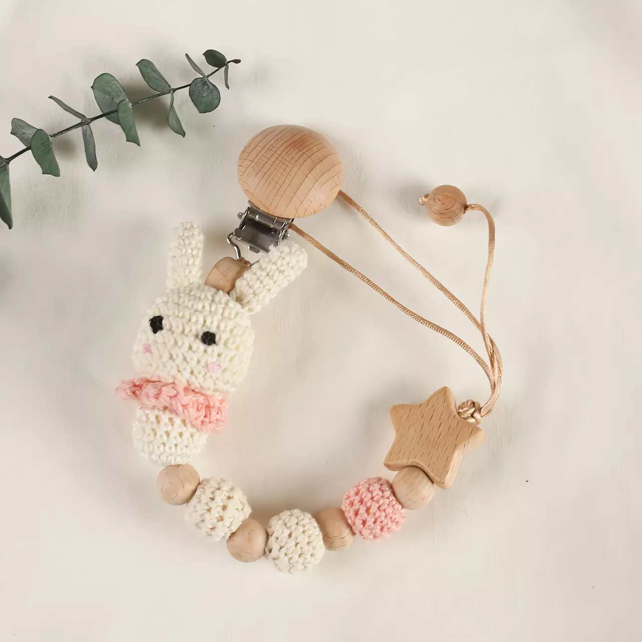 What makes the Baby Rabbit Pacifier Chain Clip special is its thoughtful design that combines functionality with aesthetics. The natural wood and soft textures provide tactile stimulation, while the cute rabbit shape adds a delightful element to your baby’s everyday essentials.