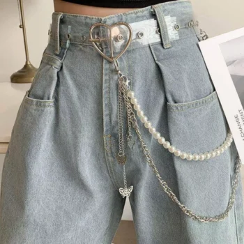 Hip Hop Punk Silver Metal Pearl Chain Belt for Jeans