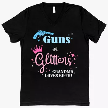 V-Neck Guns or Glitters Grandma Loves Both T-Shirt – Gender Reveal T-Shirts for Grandparents – T-Shirts for Grandma