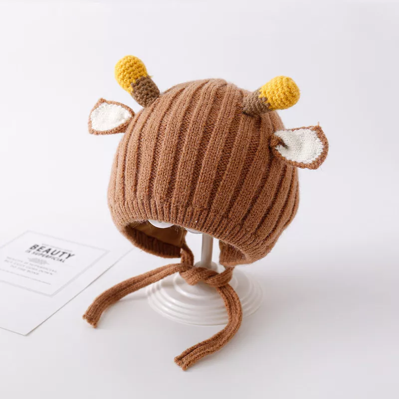 Cute Knit Deer Ears Baby Beanie with Windproof Rope – Warm Winter Hat for 6-24 Months