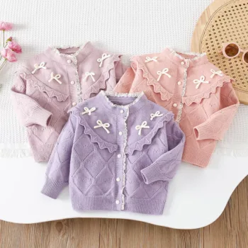 Autumn Winter Baby Girls Knit Cardigan with Lace and Bow