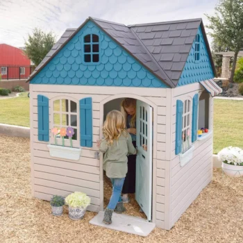 Grandchildren’s Durable Outdoor Playhouse with Working Doorbell & Toy Kitchen, Beige & Blue