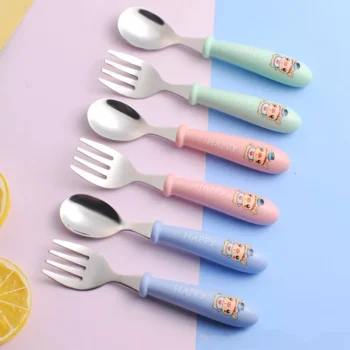 Stainless Steel Toddler Cutlery Set – Cartoon Infant Feeding Spoon & Fork with Travel Case