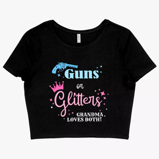 Women’s Cropped Guns or Glitters Grandma Loves Both T-Shirt – Gender Reveal T-Shirts for Grandparents – T-Shirts for Grandma