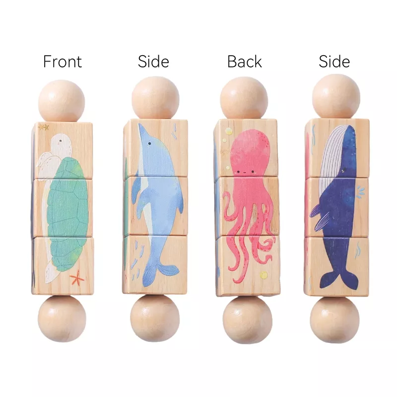 Wooden Montessori Baby Teething Toy with Musical Rattle and Cartoon Blocks